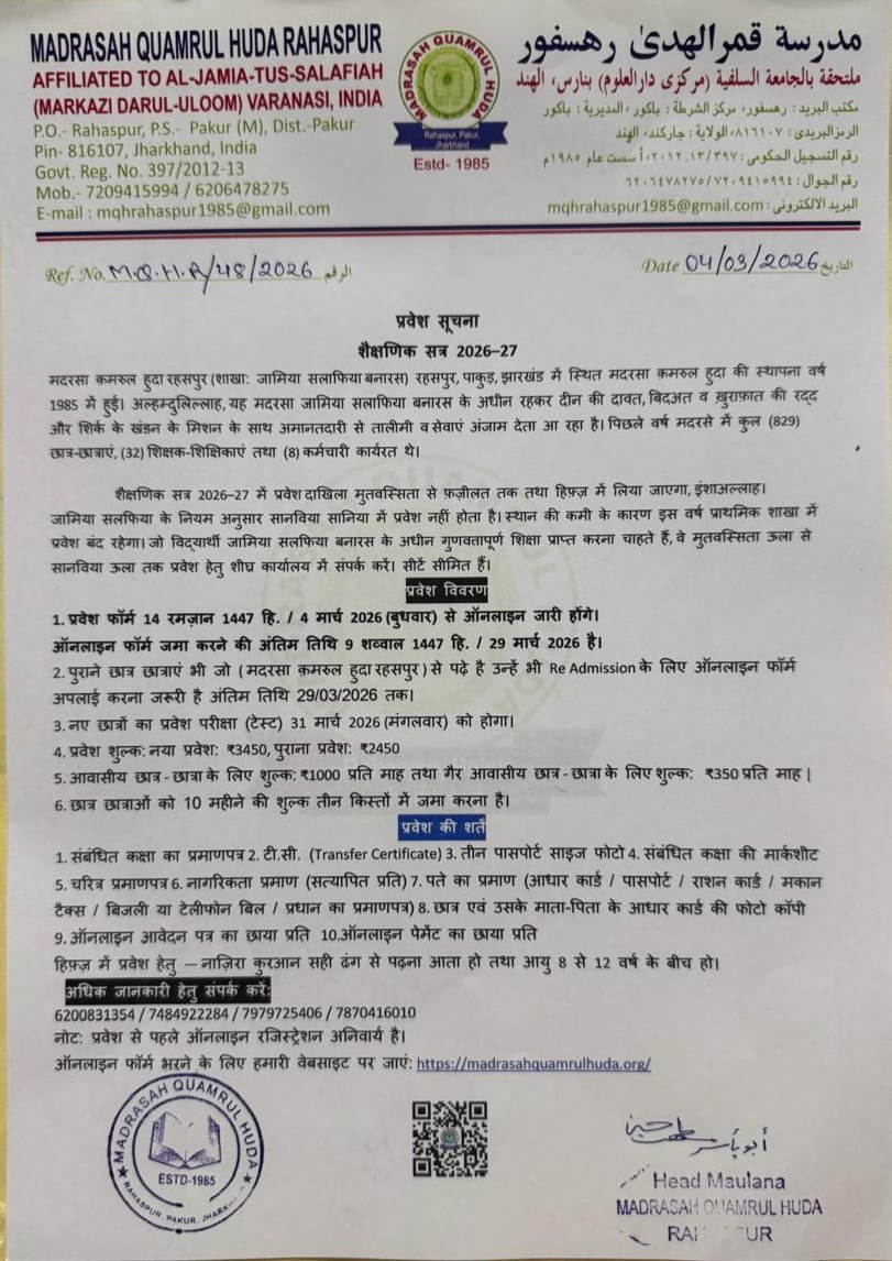 Application for admission in academic session 2026-2027 will start from 4th March 2026. Please visit the official website of Madrasah Quamrul Huda Rahaspur for more details. Application process will be online.